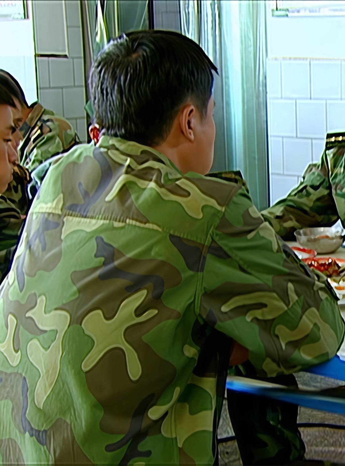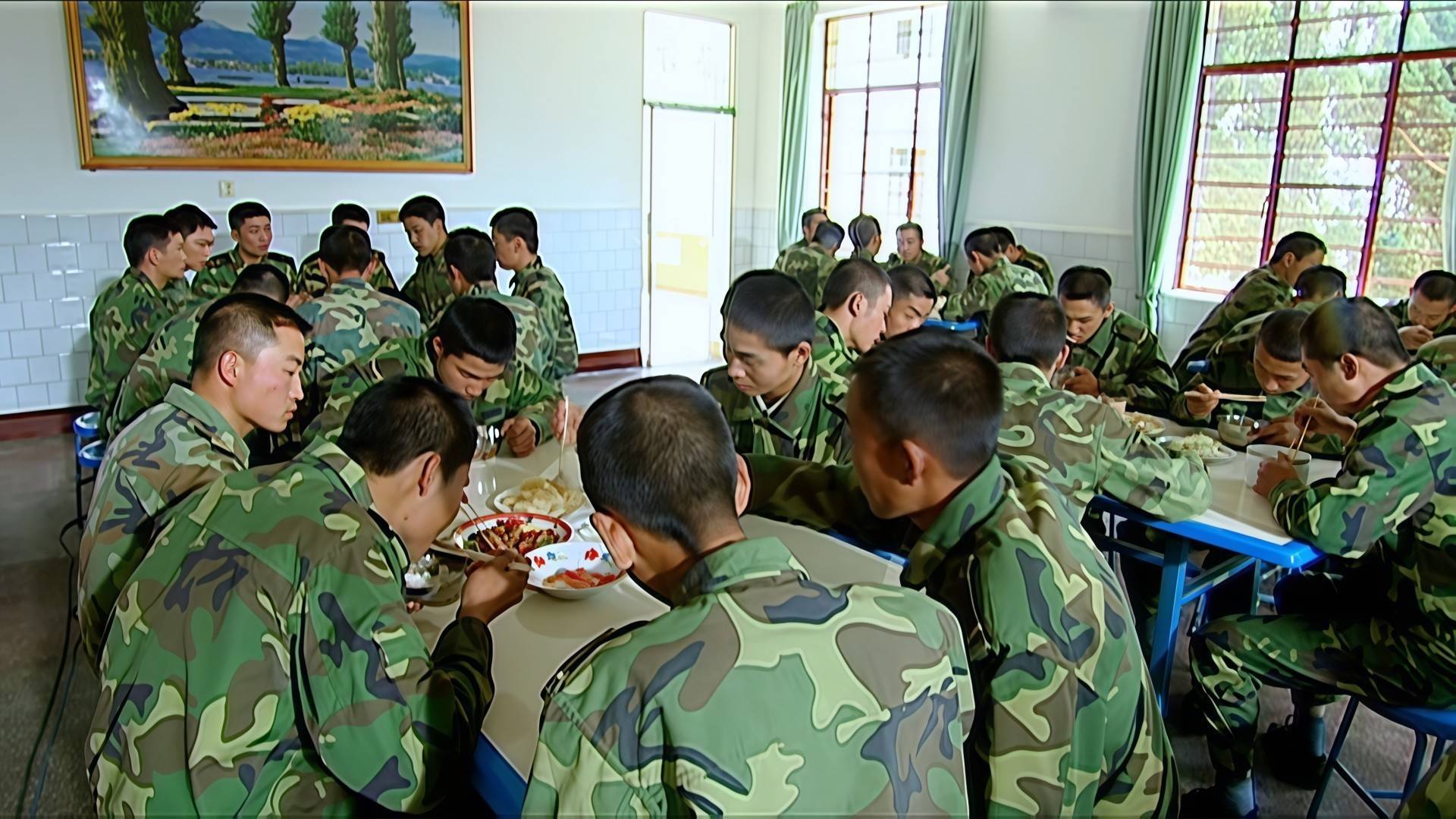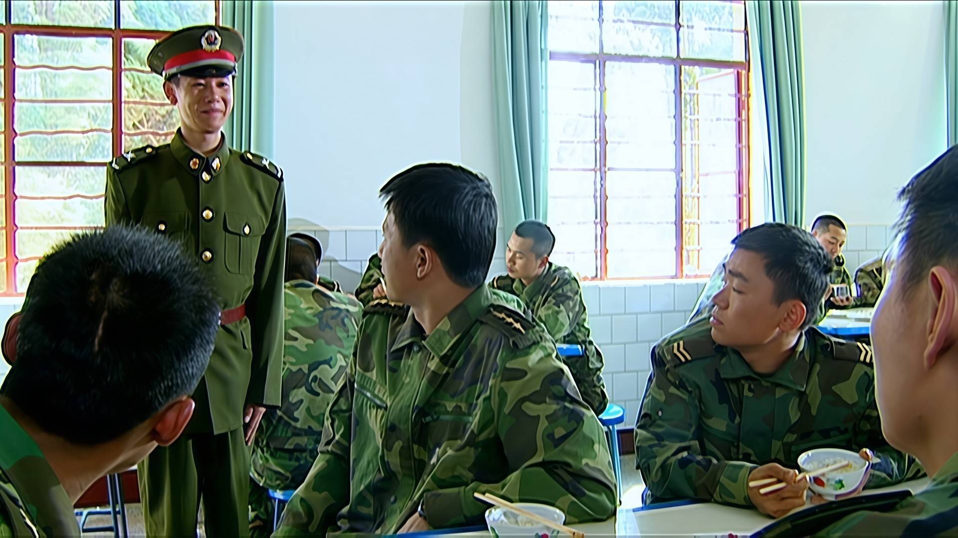 真没有开玩笑,你看看他们一大群人,一张桌六个人,就一碗饭,然后,几碟菜,显然伙食待遇是很差的,那为啥吃得那么差呢?其实,这还真不一定是部队真实伙食差,而是剧组太穷了,很多人不知道,这部剧原来的剧本就最起码有多出3集的剧情,导演拍到一半时,钱已经花了一大半了,为了省钱,只能在道具上能省则省了。