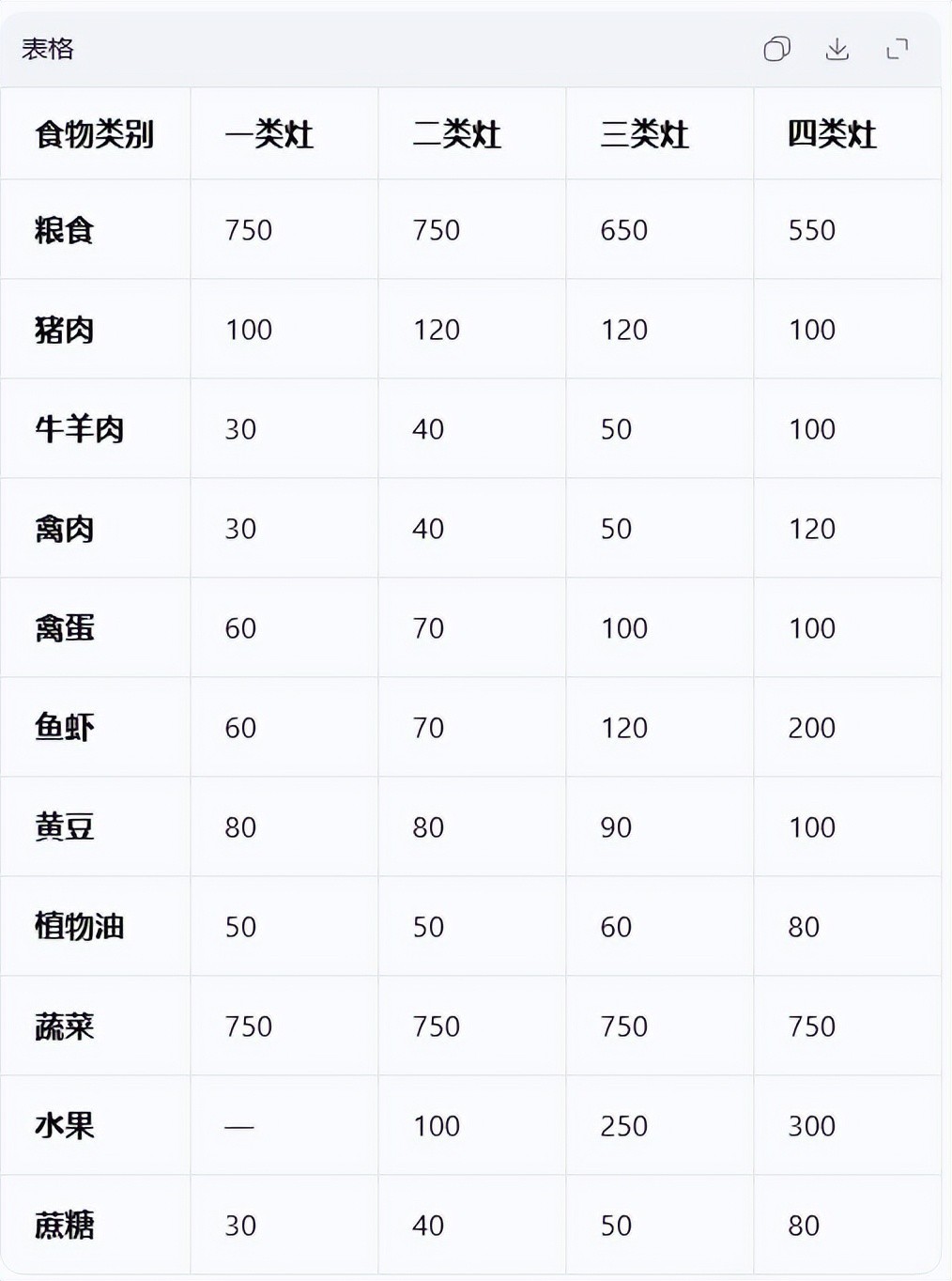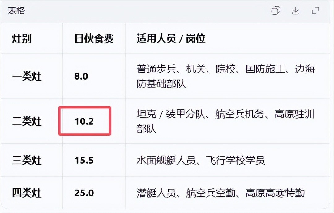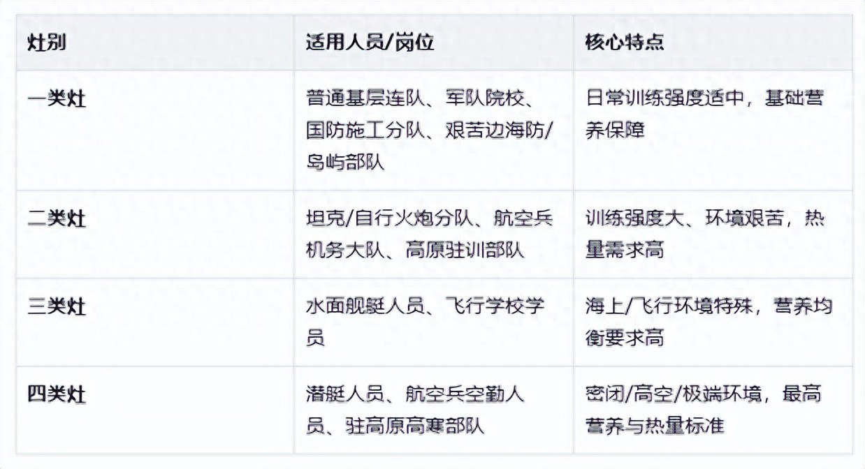首先,我们先看一张我国部队的伙食划分表格,目前我国部队的伙食标准是分成了四个等级,分别是一类灶到四类灶,一类灶是最低等级的,一般只有基础营养保障,而二类灶开始伙食情况就开始好起来了,因为这个二类灶的训练强度比较大,剧中702团就是属于这类等级,到了最顶级的四类灶,那伙食待遇是真心不错,那享受到的营养和热量都是非常高的。