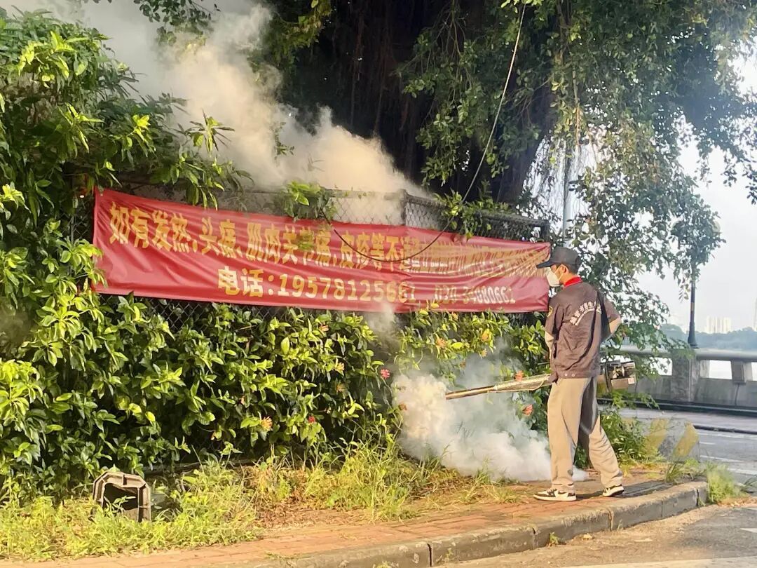 10月14日,番禺区大石街星河湾社区居委会上午组织30人队伍,清理300平方米绿地死角,顶着高温铲除杂草、清运垃圾;下午紧接消杀行动,4名工作人员分工协作,330斤药剂实现“高低全覆盖”,蚊虫密度显著下降。