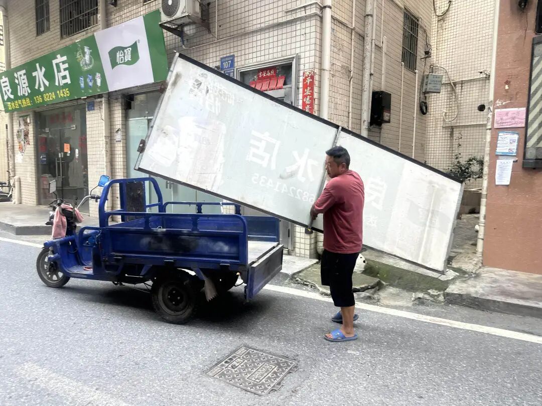 10月14日下午,记者来到白云区永平街磨刀坑社区,多名身穿红马甲的工作人员正拿着各种工具清理商户门口、小巷垃圾与积水。